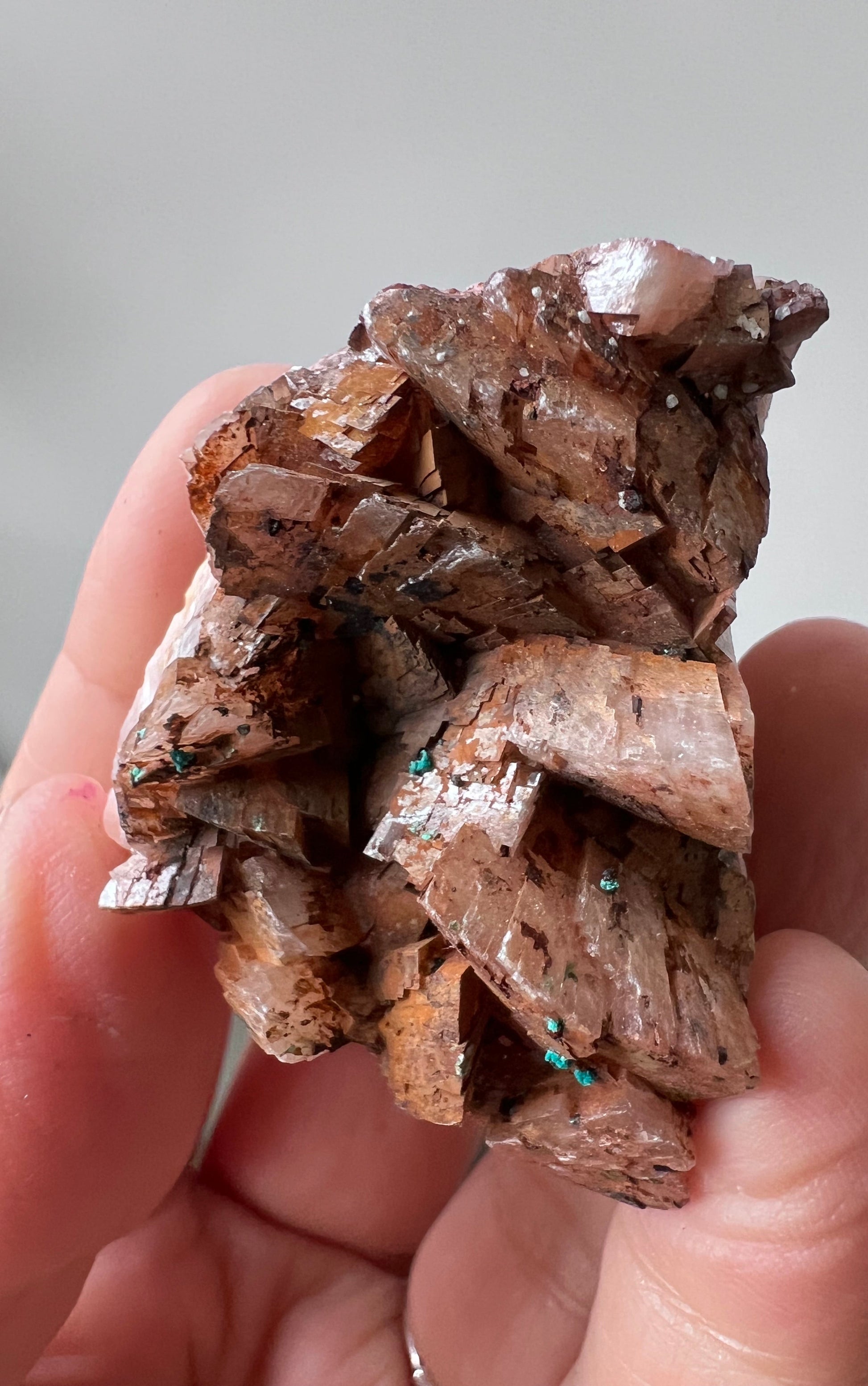 This is a natural Dolomite cluster featuring warm peach–tan crystal formations with multiple green Malachite inclusions throughout the specimen. The dolomite displays stacked, blocky crystal habits typical of Moroccan mineral deposits, while the malachite forms small, rounded growths that add striking contrast to the piece.