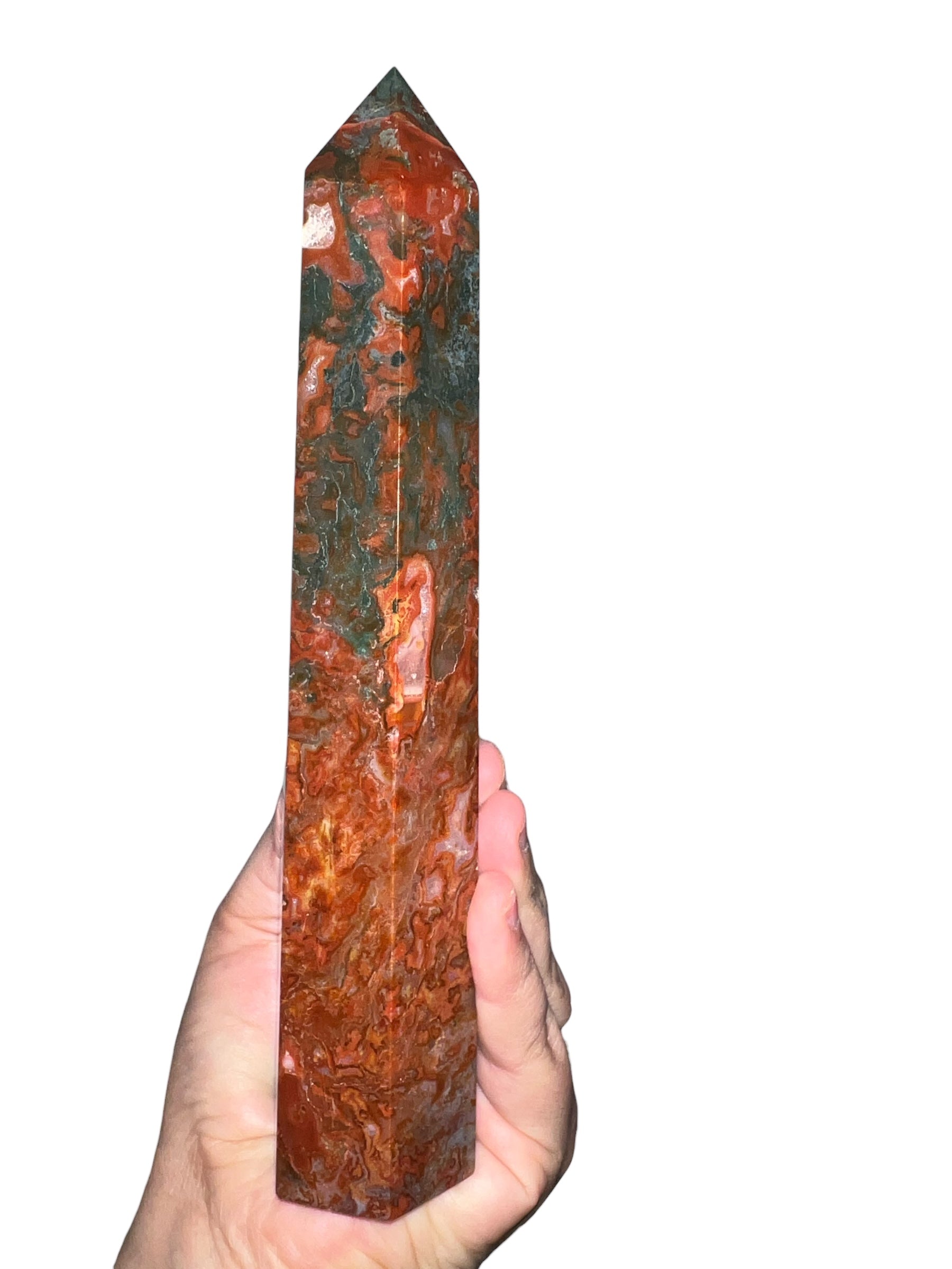 This breathtaking Red Moss Agate tower features swirling fiery reds, earthy browns, and forest-green inclusions that look like tiny landscapes frozen in stone. Natural druzy pockets sparkle in the light, adding a magical, organic texture that makes this piece truly one-of-a-kind.