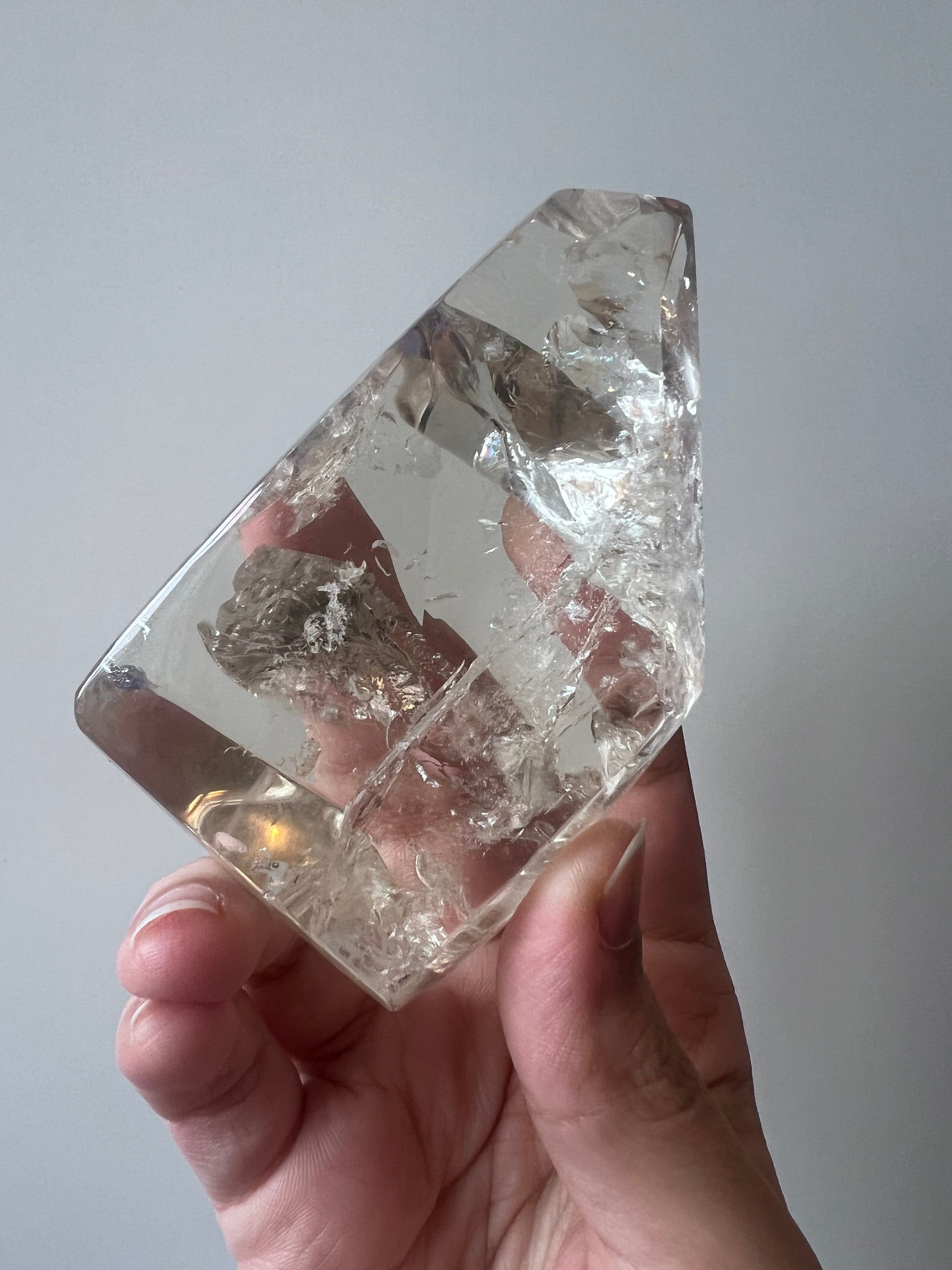 Bring grounding, confidence, and radiant abundance into your space with this high-grade Smoky Citrine Tower. This stunning piece displays warm champagne hues with subtle golden citrine tones, shimmering internal rainbows, and beautifully preserved natural fracture patterns — creating a “galaxy inside a crystal” effect.