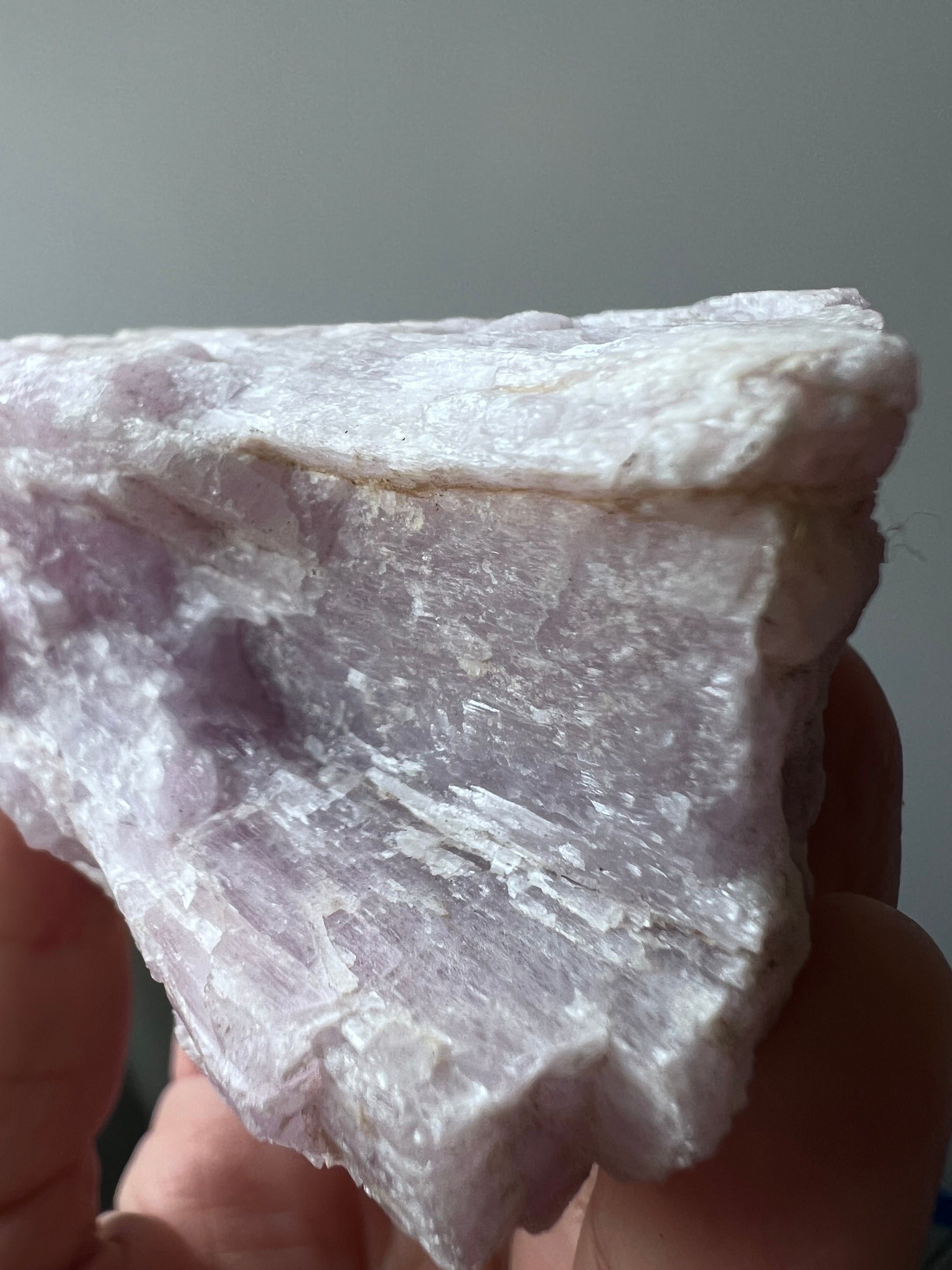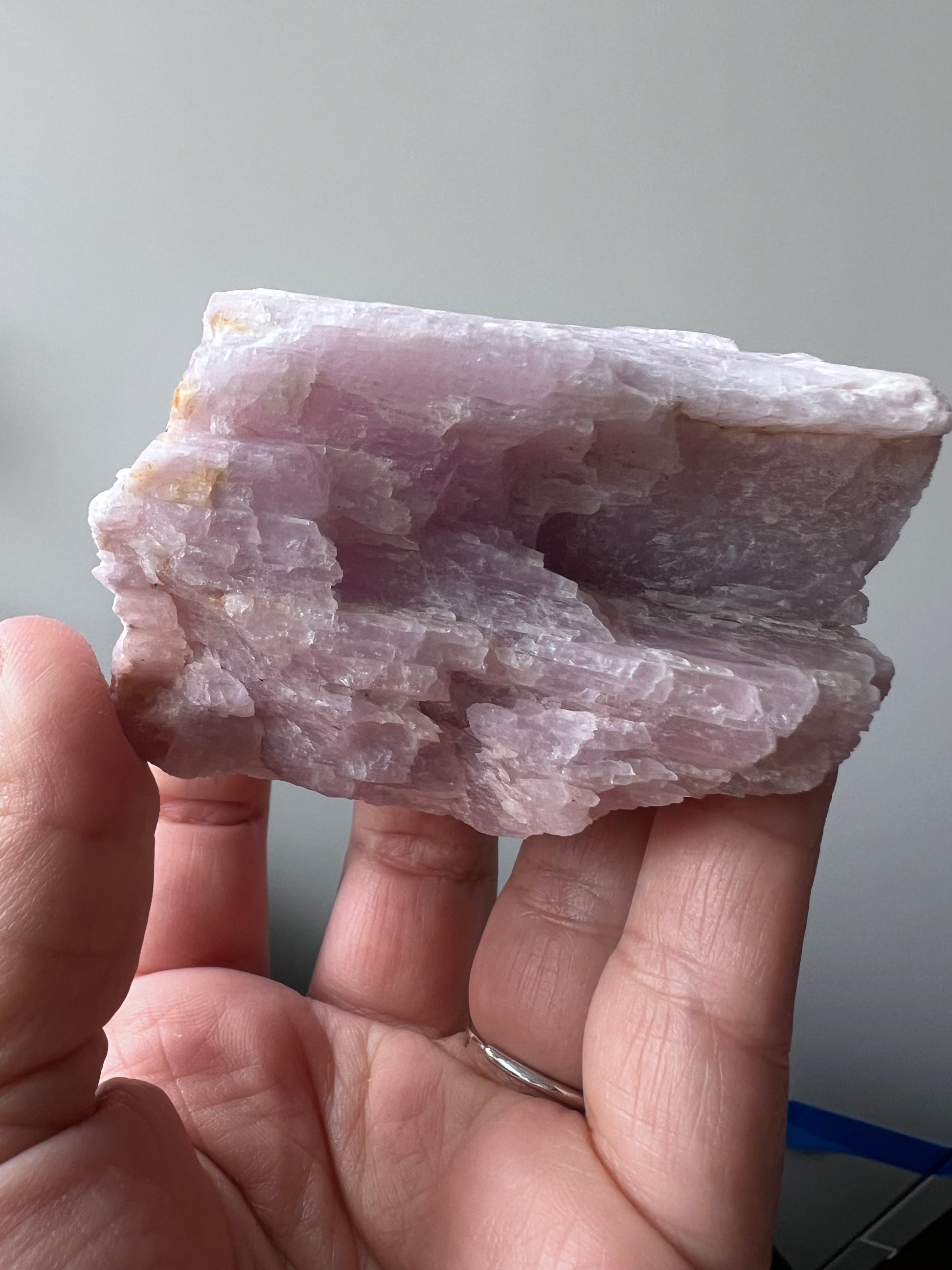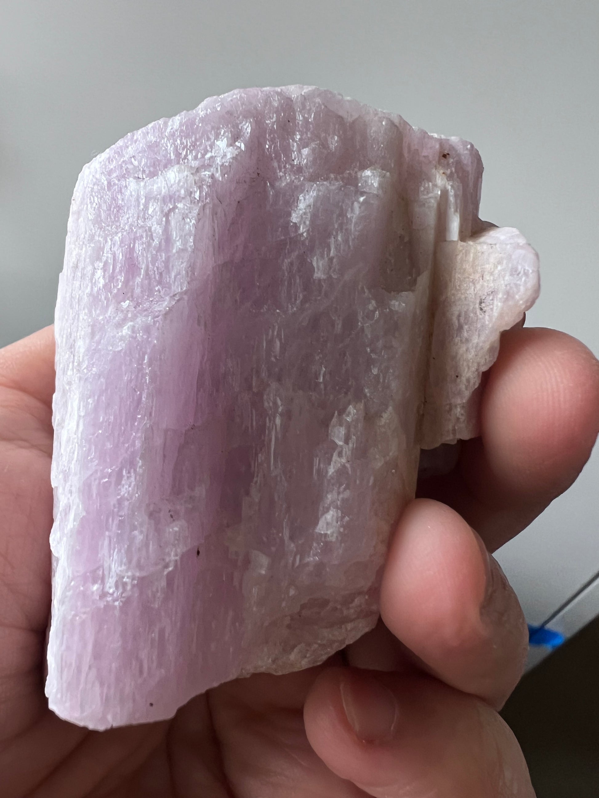This beautiful raw Kunzite specimen displays soft lavender-pink coloring with natural vertical striations typical of high-quality spodumene. The surface shows a mix of smooth and rugged textures, giving it a natural, untouched appearance perfect for collectors, crystal lovers, and energy work.