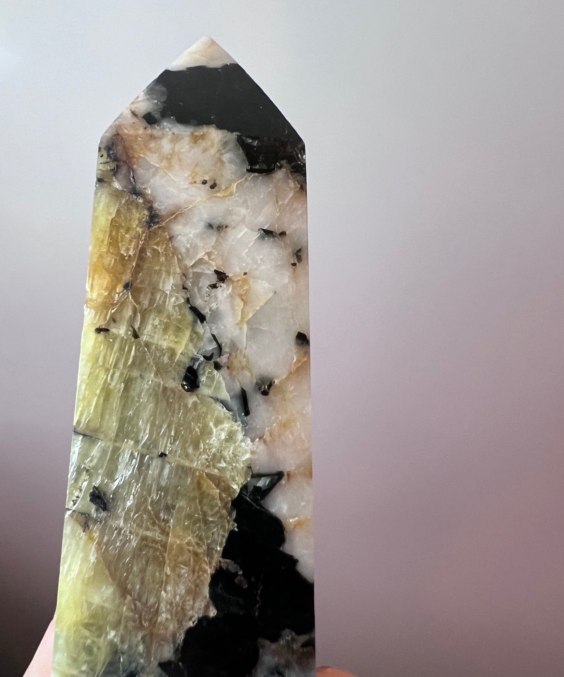 This stunning Yellow Tourmaline with Black Mica Tower is a powerful and visually striking piece ideal for collectors, healers, or anyone drawn to grounding yet uplifting energy. Featuring shimmering golden tourmaline blades embedded in snowy white quartz and anchored by bold black mica inclusions, this tower brings a beautiful balance of light and shadow.
